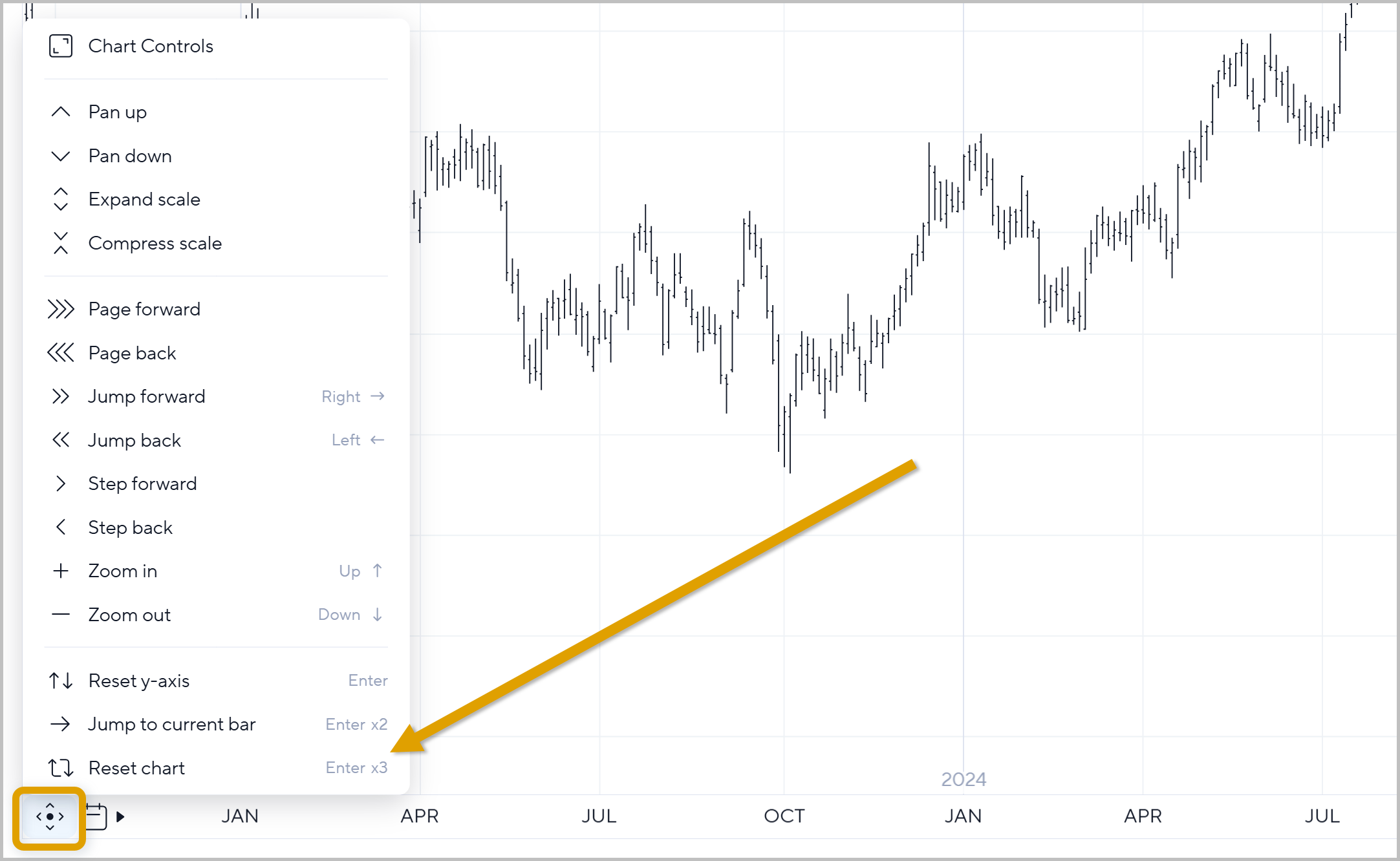 You can access the Chart Controls/Navigation menu by clicking the icon in the lower left corner. You have the option to Reset the x-axis, y-axis or both from this menu. It will also provide the appropritate shortcut using the Enter key.