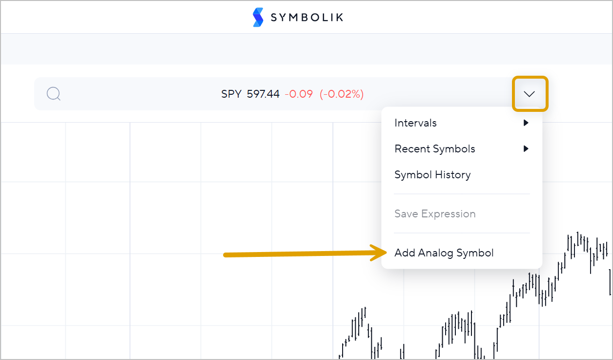 - Add an Analog Symbol: Click Add Analog Symbol from the drop down menu on the Symbol Search bar. Enter your symbol and hit enter.