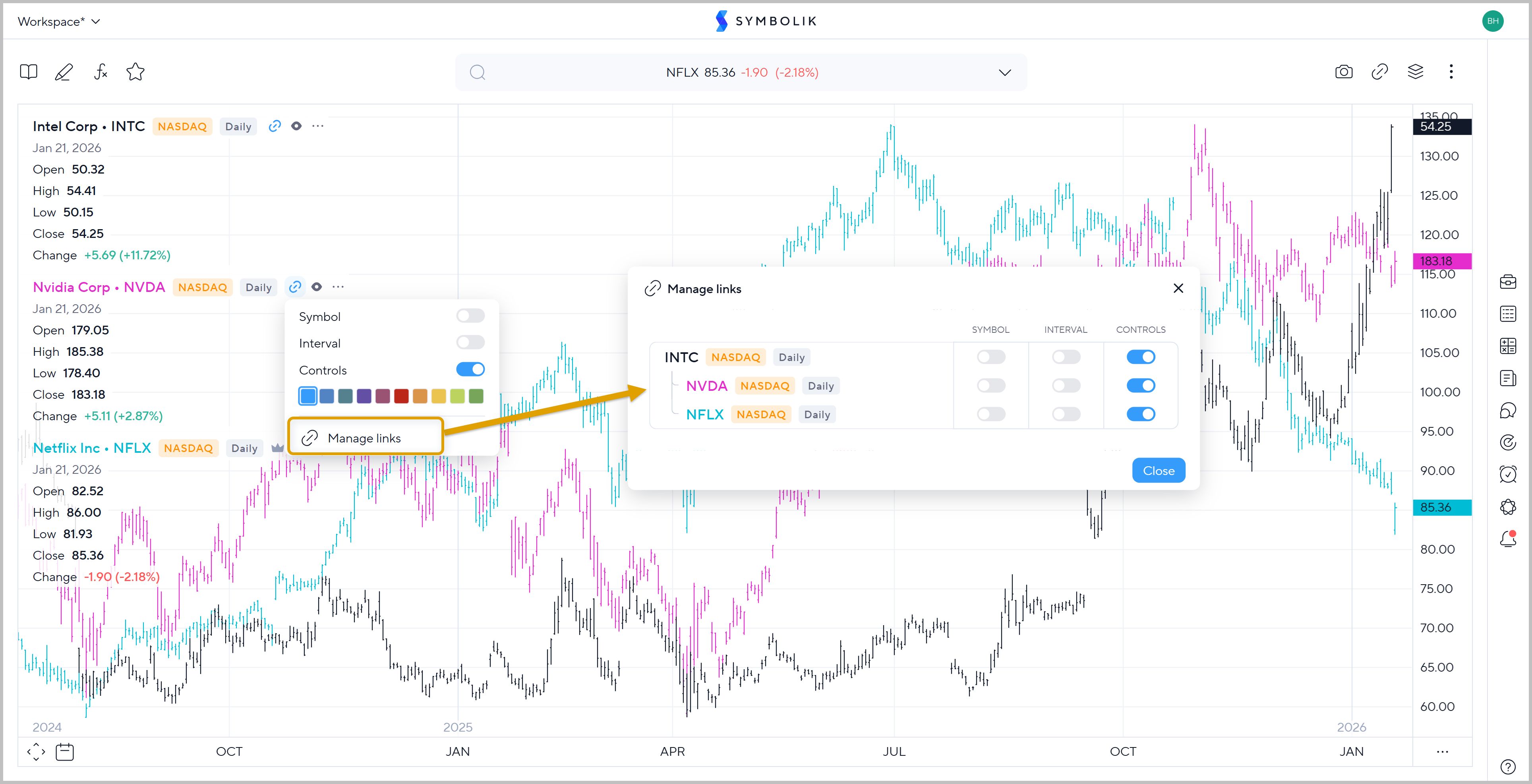 Choose which symbol is active in order to change symbols, add study's or otherwise interact with the chart from the drop down menu on the Symbol Search bar.