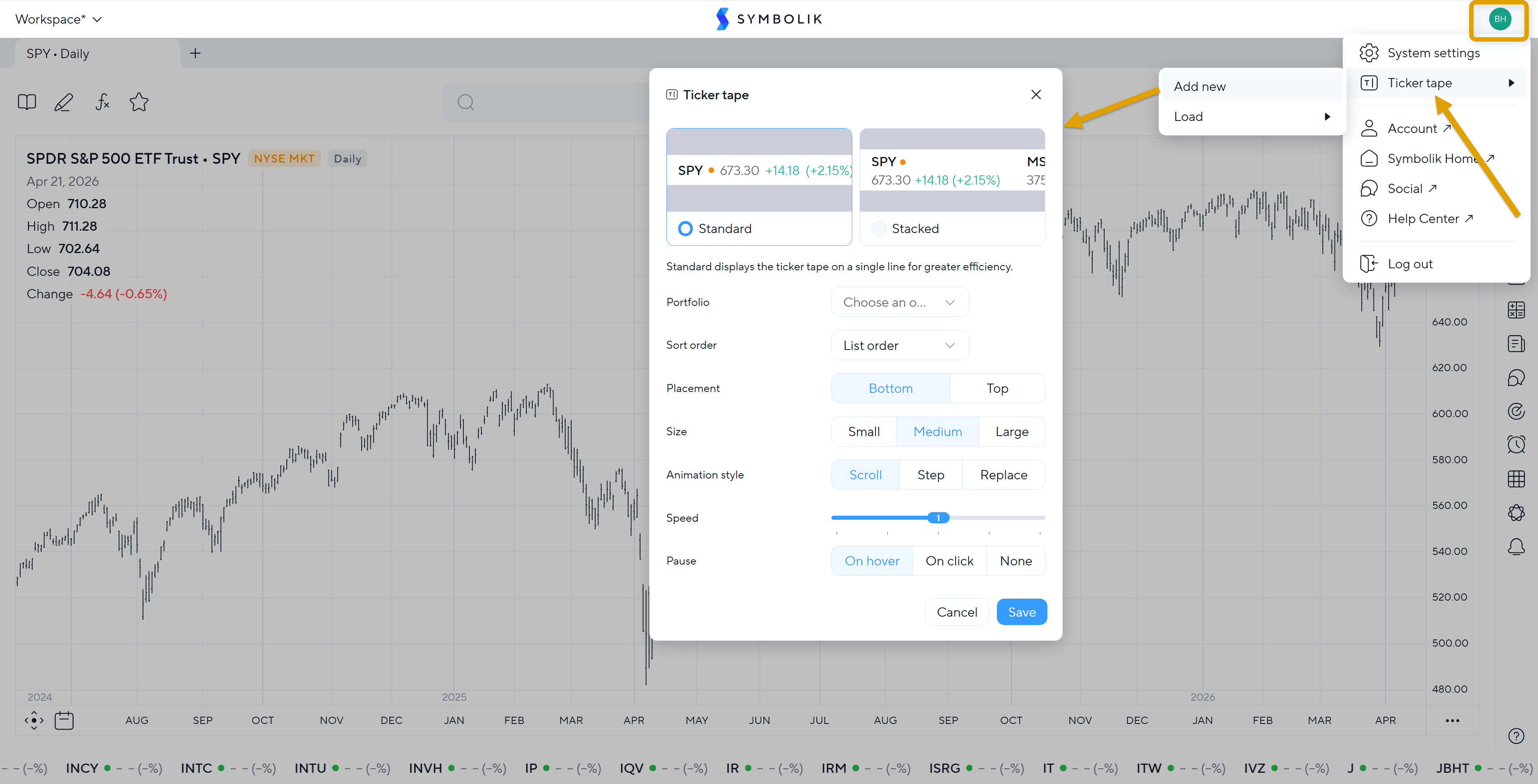 - The ticker tape will automatically populate with symbols from the selected list